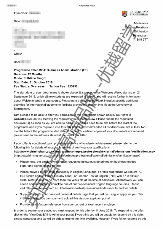 2018offer:恭喜吳同學獲得伯明翰大學MBA課程通知書