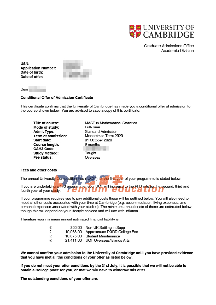 2020offer:恭喜袁同學獲得劍橋大學統計數學專業碩士通知書