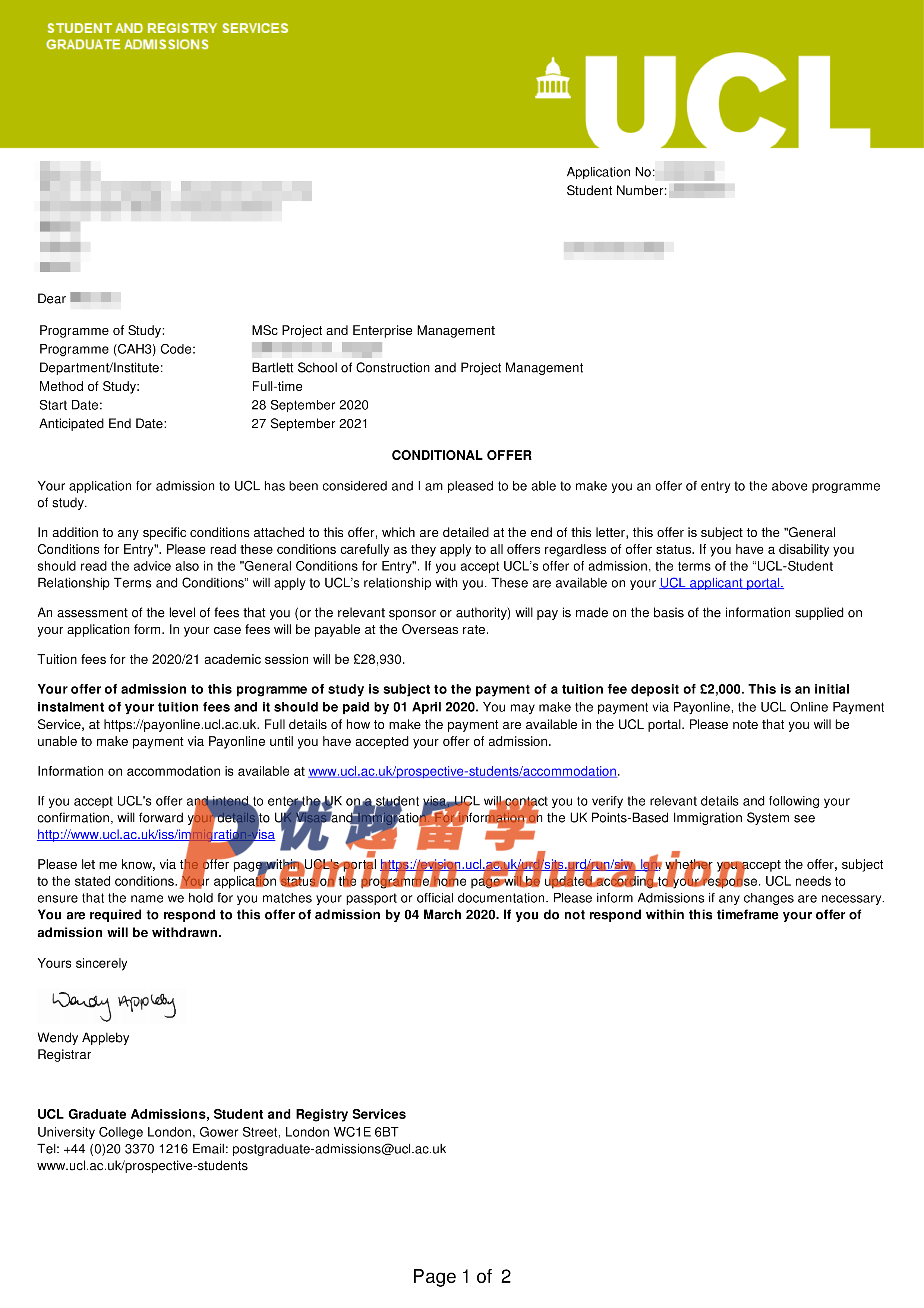 2020offer:恭喜杜同學獲得倫敦大學學院項目和企業管理碩士專業碩士通知書