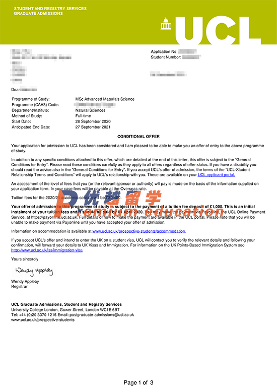 2020offer:恭喜劉同學獲得倫敦大學學院高等材料科學碩士通知書