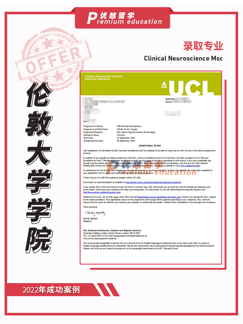2022offer:恭喜陳同學獲得倫敦大學學院臨床神經科學專業碩士通知書