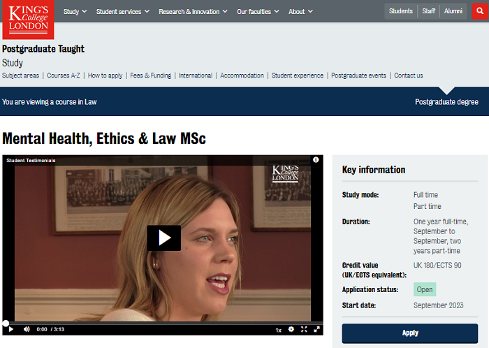 心理健康、倫理和法律理學碩士課程由兩個國際公認的卓越中心提供,并提供綜合的、高度跨學科的心理健康、倫理和法律教育。它幫助畢業生成為醫療保健、心理健康法律或政策方面的領導者。該計劃的學生將有獨特的機會與來自倫敦法律和精神病學世界中心的廣泛學術和專業學科的其他人一起學習。