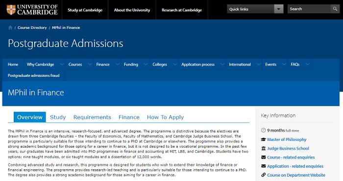 金融碩士是一個密集的以研究為重點的高級學位。該課程的特殊之處在于,選修課來自三個劍橋學院——經濟學院、數學學院和劍橋賈奇商學院。該計劃特別適合那些打算繼續在劍橋或其他地方攻讀博士學位的人。該項目還為那些選擇金融職業的人提供了強大的學術背景,但它并不是一個職業項目。在過去的幾年里,該項目的畢業生被麻省理工學院、倫敦商學院和劍橋大學的金融和會計博士項目錄取。學生有兩種選擇:九個教學模塊,或六個教學模塊和一篇12,000字的論文。