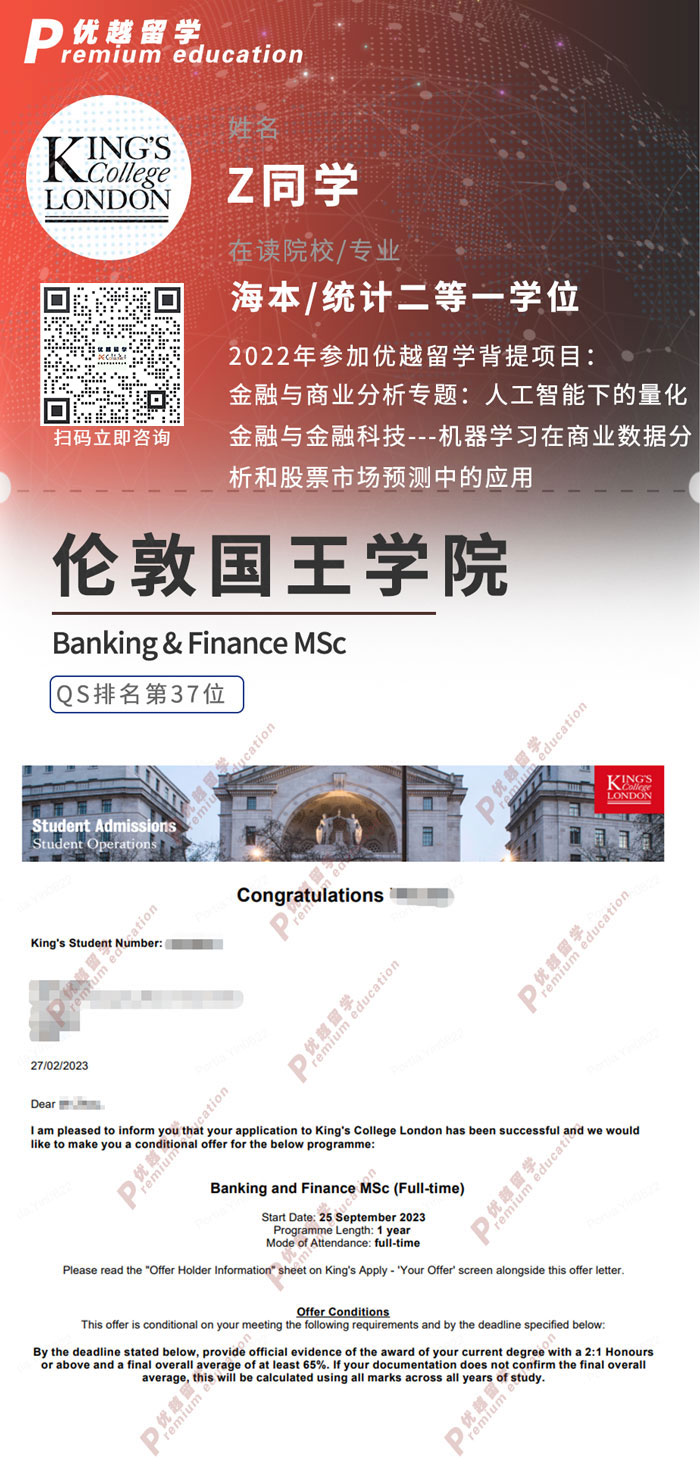 2023offer:恭喜Z同學在碩士留學申請中獲得KCL銀行與金融碩士通知書!