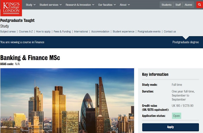 銀行與金融碩士(MSc Banking and Fiance)隸屬于KCL商學院,適合在本科階段學習過金融、管理/商業/經濟學,或來自數學、工程或物理等量化學科的學生。該專業提供全面的金融教育,主題廣泛,包括商業和投資銀行業務、金融衍生品、風險管理、金融監管和行為金融。課程還側重于有重大量實踐的領域,例如投資分析和管理、資產和風險管理、并購等等。