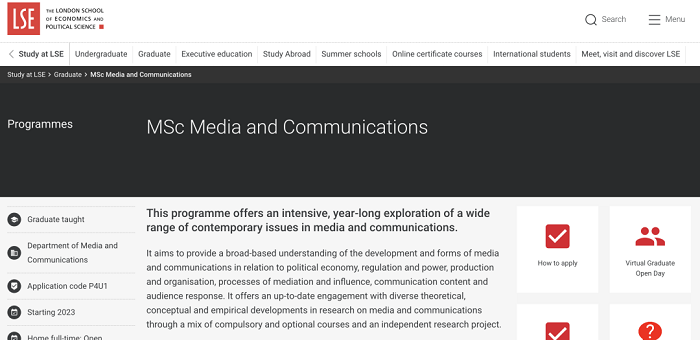最低入學要求為(a) 社會科學 2:1 學位或同等學歷,或 (b) 其他領域 2:1 學位或同等學歷,并具有媒體和傳播領域的專業經驗