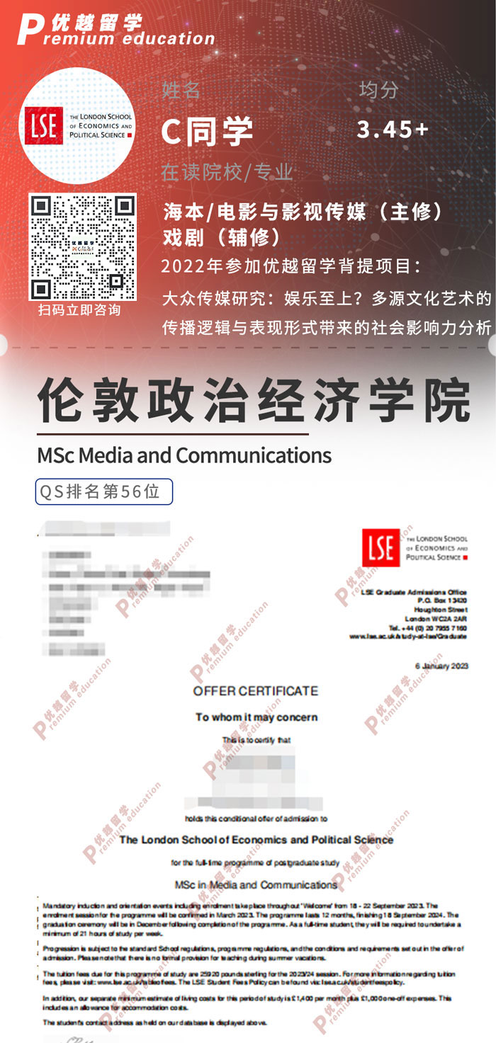 2023offer來襲!恭喜C同學在碩士留學申請中斬獲倫敦政治經濟學院媒體與傳播碩士通知書!