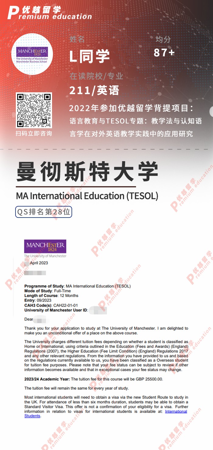 2023offer來襲!恭喜L同學在碩士留學申請中斬獲國際教育(TESOL)碩士通知書!