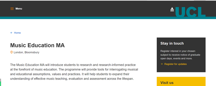 從事音樂教育碩士課程將使學生能夠培養他們的批判性思維和能力,以審視音樂和音樂教育總體領域的當前教育研究、文學和實踐。他們還將有機會與該領域的知名學者一起從事與自己的專業和/或學術興趣相關的專業研究。