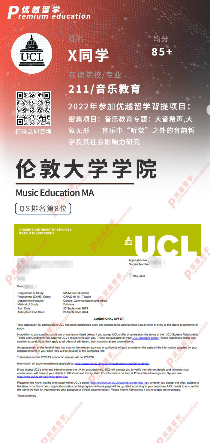 2023offer來襲!恭喜X同學在碩士留學申請中斬獲倫敦大學學院UCL音樂教育碩士通知書!