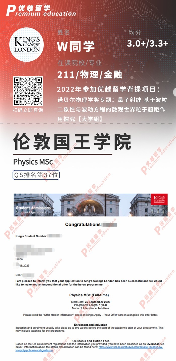 2023offer來襲!恭喜W同學在碩士留學申請中斬獲倫敦國王學院KCL物理學碩士通知書!