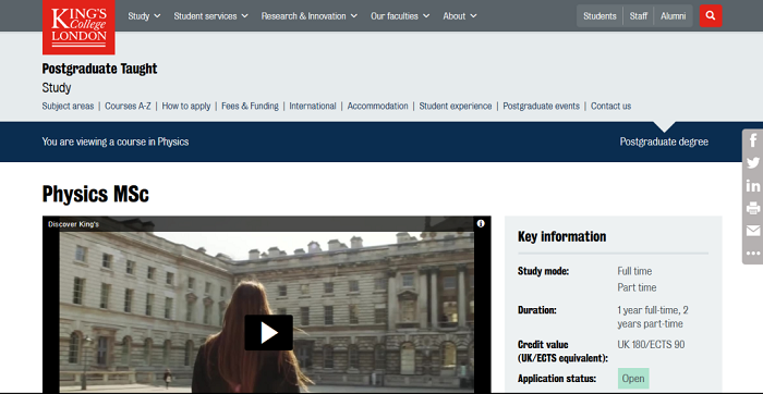 倫敦國王學院的物理學碩士課程的優勢在于:該課程在英國物理學排名前 10 位(2022 年 QS 世界學科排名);該課程中以研究為主導的課,都由領域公認的領導者教授;對實驗物理學感興趣的學生有機會學習最先進的實驗納米等離子體學、生物成像、近場光學和納米光子學,并進入倫敦納米技術中心(LCN)的實驗室,且有機會參加學院在光子學和超材料方面的旗艦課程;對于對理論物理感興趣的學生,有機會參加學院的標準模型物理與超越和高級凝聚態的旗艦課程。