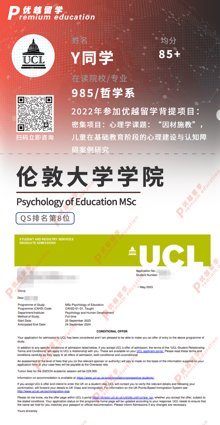 2023offer來襲!恭喜Y同學在碩士留學申請中斬獲倫敦大學學院UCL教育心理學碩士通知書!