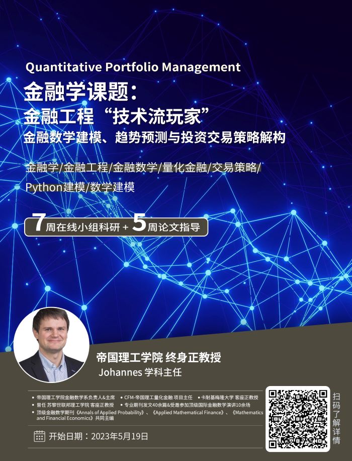 1、本項目適用于對金融數據量化和分析、金融數學、統計學、金融工程等定量領域分析專業的大學生;該項目也適用于具有較強數學背景的高中生。參與學生需要具備概率論與數理統計基礎及Python編程能力;