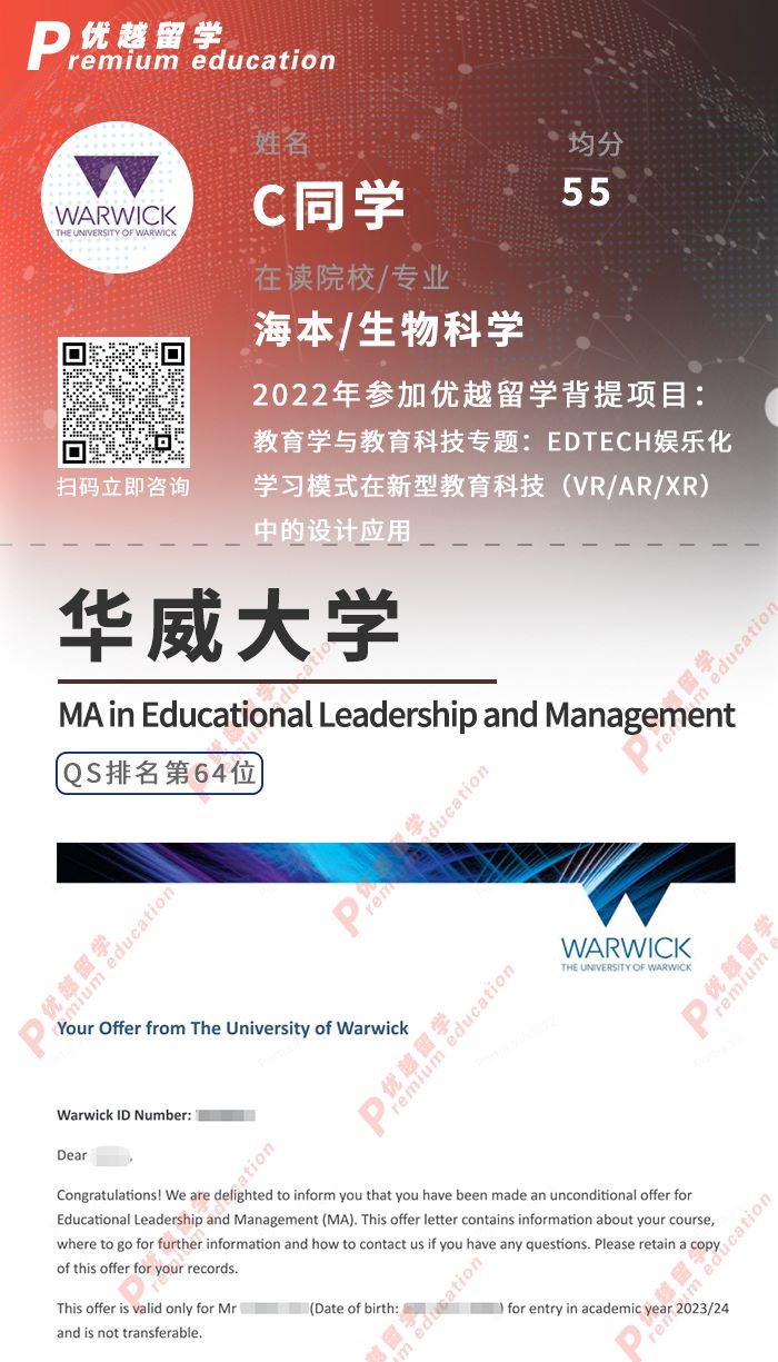 2023offer來襲!恭喜C同學在碩士留學申請中斬獲華威大學食品安全碩士通知書!