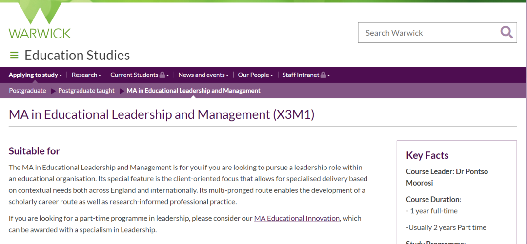 此課程將使學生能夠發展和提高學生作為教育領導者的能力。它還將增強學生的反思和批判能力,為他們下一步的職業發展打下良好的基礎。該課程的應屆畢業生包括課堂領導創新者、中層領導、高級管理人員、地方當局顧問和獨立顧問,以及現在擔任一系列高級職位的國際教育工作者。每年都有一些該課程的畢業生繼續攻讀博士學位。