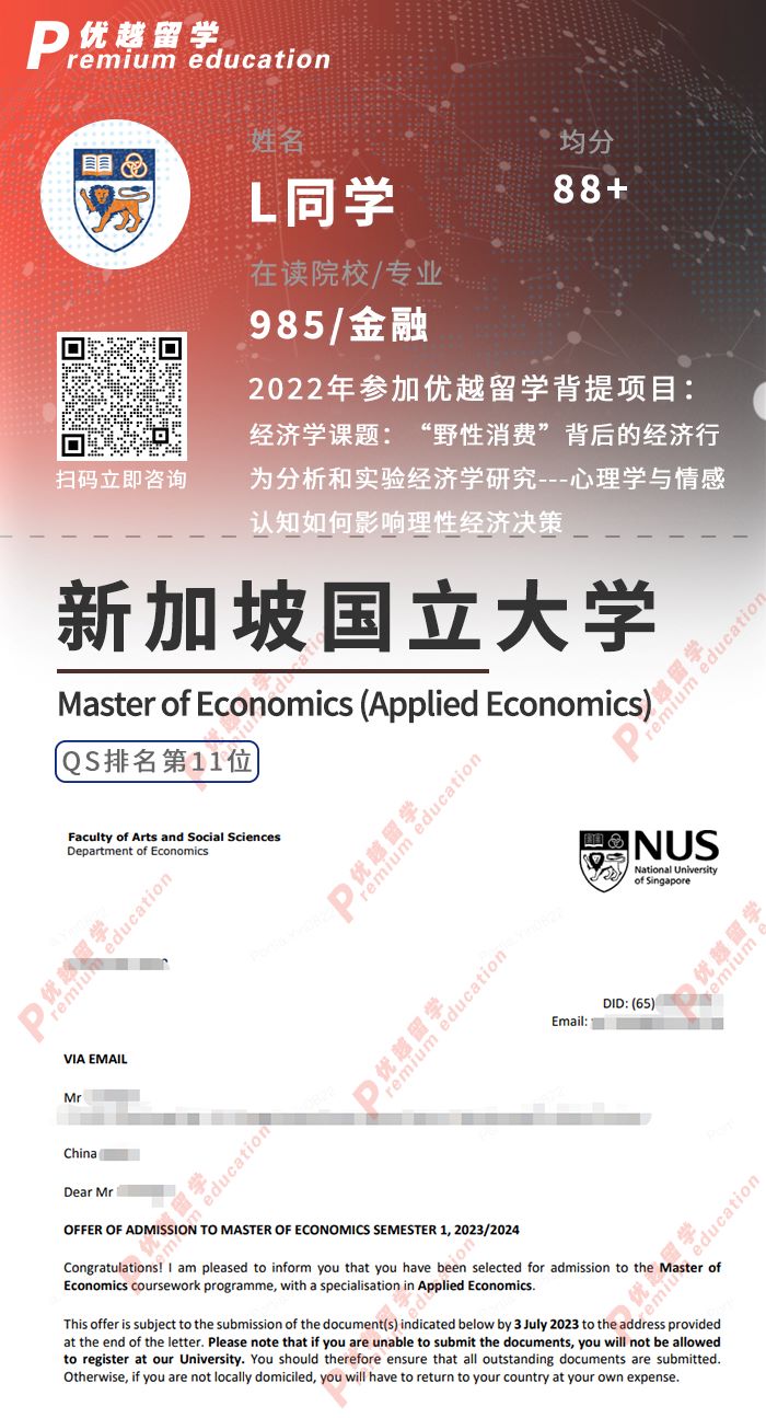 2023offer來襲!恭喜L同學在碩士留學申請中斬獲新加坡國立大學應用經濟學碩士通知書!