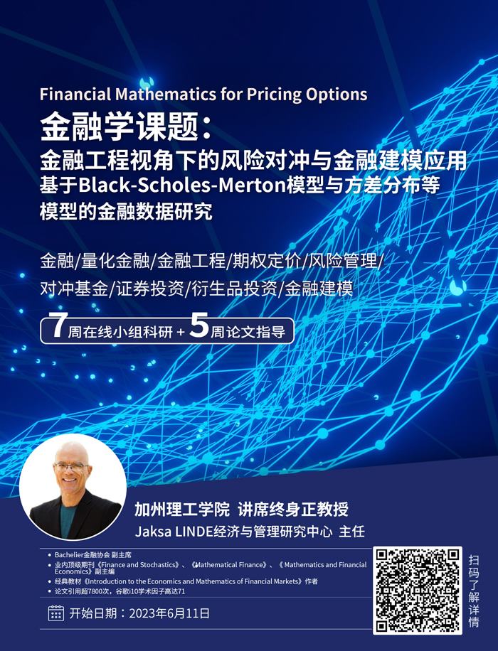 2.在這個項目中,學生將學習和研究金融工程中的核心定價模型:Black-Scholes-Merton模型,并將其運用在金融衍生品投資中的期權定價測算和對沖策略中。 在此之前,導師將詳細解釋金融工程中的基礎數學模型,包括隨機微積分導論:布朗運動、伊藤法則、費曼-卡茨定理和吉薩諾夫定理。然后學生將這些模型在金融交易市場中進行實踐,來對金融投資數據進行模擬分析,這其中包括高階的隨機波動模型和跳躍模型。