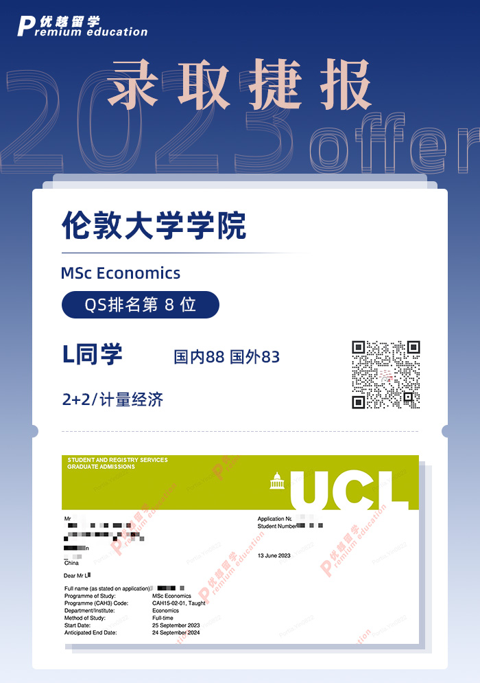 2023offer:恭喜L同學在碩士留學申請中獲得UCL經濟學碩士通知書?。?/p>