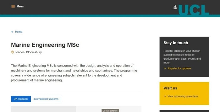 倫敦大學學院的海洋工程碩士課程涉及商船和海軍船舶及潛艇的機械系統設計、分析和操作。該課程涵蓋了與海洋工程發展和采購相關的廣泛工程科目。學生將學習推進系統和輔助設備的分析和設計,以適應最新的海洋船舶設計。 此外,學生們還將學習計算機在高級工程分析中的應用,發展對工程元素的理解,并通過小組的個人項目來有效應用個人專業知識。