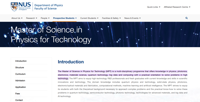 新加坡國立大學的科技物理學碩士(MPT)是一個多學科課程,提供物理學、光子學、電子學、材料科學、量子技術、大數據和計算方面的知識,以解決高科技方面的問題。MPT旨在使高科技研發人員和應屆畢業生掌握科學創新和技術方面的最新知識和技能。該領域的知識包括量子物理和技術、固態物理學、光子學、電子/光學材料和制造、計算方法、機器學習和人工智能。MPT努力使其學生既具備處理復雜問題所需的理論背景,又具備解決這些問題的實際知識,包括量子技術、半導體技術、光子技術、先進材料技術以及大數據和人工智能技術等。