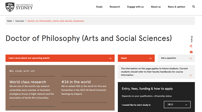 悉尼大學的藝術和社會科學學院一直被列為世界上杰出的人文和社會科學研究中心之一。該學院提供博士學位的學科涉及視覺藝術和藝術史、考古學和古典文學、各種現代語言及其文化、經濟學、英語語言和文學、古代、中世紀和現代歷史、哲學、全球政治經濟和國際治理、社會學和文化研究、媒體和通訊、教育和社會工作。作為課程培訓的一部分,悉尼大學的博士生需要在其候選資格的早期完成一些課程作業。學生還可以參加一系列的專業學習單元,以發展他們的研究技能。