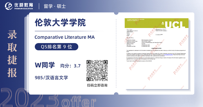 2023offer來襲!恭喜W同學在碩士留學申請中斬獲倫敦大學學院比較文學碩士通知書!