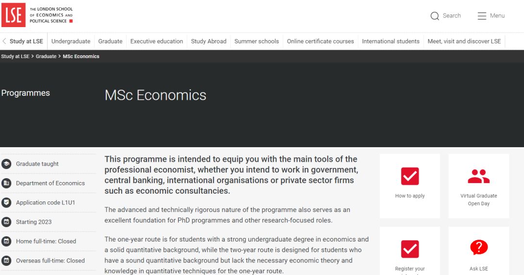 如果學生的第一個學位不是經濟學,學生應該申請參加經濟學碩士(2年)課程 。具有技術學位和強大的定量背景的候選人可能希望考慮申計量經濟學和數理經濟學理學碩士 。沒有英國經濟學本科學位的申請人需要 GRE。