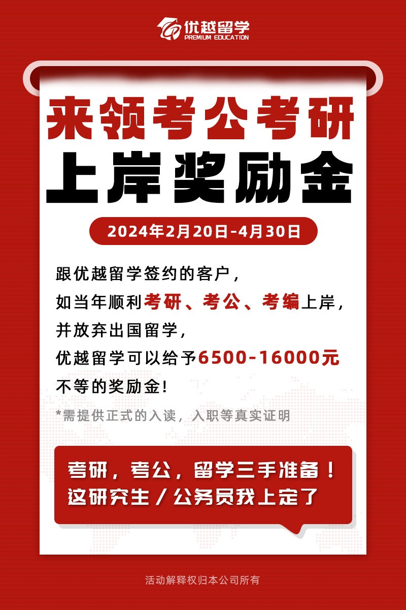 凡2024年2月20日至2024年4月30日期間與優越簽約的用戶,如當年順利考公、考編、考研上岸,并放棄出國留學,優越可給予6000-16000不等的獎勵金。
