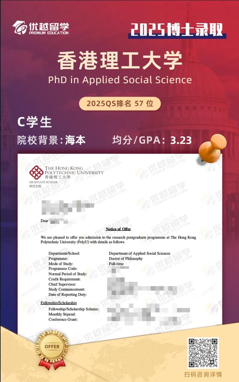 恭喜優越學員博士留學申請首戰告捷,拿下香港理工大學應用社會科學博士offer。接下來,就跟優越君一起看看,C同學的上岸歷程~