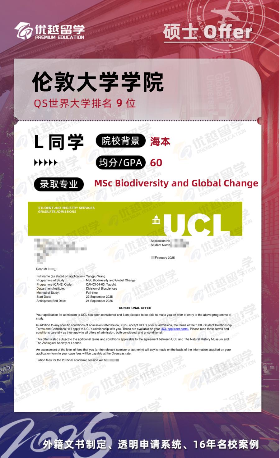 L同學是去年7月來到優越的,動物學專業出身,研究生申請上岸UCL。接下來,就跟優越君一起看看這位同學的英國留學研究生申請申請詳情吧~