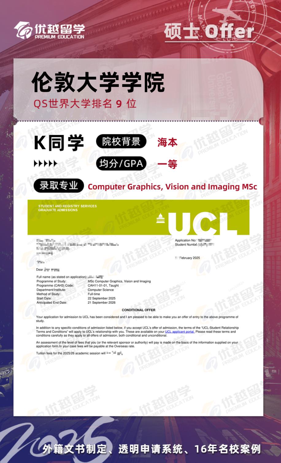 以上是【25fall英國碩士留學offer上新!【倫敦大學學院UCL】計算機圖形學專業】相關的全部內容,查看更多【offer榜單】、【名校案例】相關資訊可前往【優越留學】首頁!世界名校申請,找優越留學!選校定校、申請規劃、文書寫作、背景提升、方案定制一套搞定!點擊【在線咨詢】,優越留學顧問24h在線為您一對一解答!