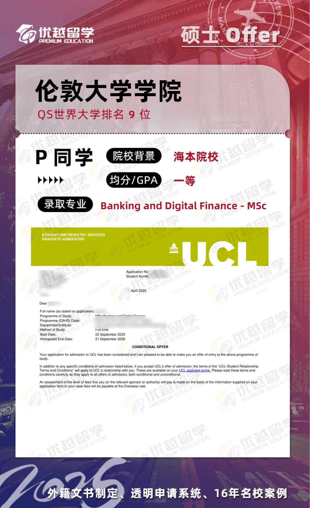 以上是【25fall英國留學碩士offer:【倫敦大學學院UCL】銀行與數字金融專業】相關的全部內容,查看更多【offer榜單】、【名校案例】相關資訊可前往【優越留學】首頁!世界名校申請,找優越留學!選校定校、申請規劃、文書寫作、背景提升、方案定制一套搞定!點擊【在線咨詢】,優越留學顧問24h在線為您一對一解答!
