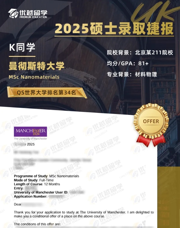 以上是【英國碩士申請offer+1:211錄取【曼徹斯特大學】納米材料專業】相關的全部內容,查看更多【offer榜單】、【名校案例】相關資訊可前往【優越留學】首頁!世界名校申請,找優越留學!選校定校、申請規劃、文書寫作、背景提升、方案定制一套搞定!點擊【在線咨詢】,優越留學顧問24h在線為您一對一解答!