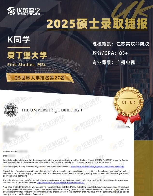 以上是【25fall英國碩士留學中介offer:【愛丁堡大學】電影研究專業】相關的全部內容,查看更多【offer榜單】、【名校案例】相關資訊可前往【優越留學】首頁!世界名校申請,找優越留學!選校定校、申請規劃、文書寫作、背景提升、方案定制一套搞定!點擊【在線咨詢】,優越留學顧問24h在線為您一對一解答!