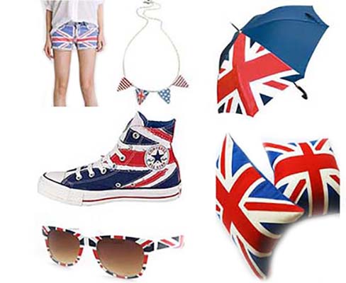 早期的英國國旗作為服裝元素更多地表現在對國旗顏色元素的使用,而不是把英國國旗完整的印在衣服上。上世紀60年代,英倫范兒的服裝風格大熱,但是衣服顏色多偏暗啞。后期的英倫風服裝加上了華麗的視覺元素,紅白藍醒目而不扎眼,成為流行顏色首選。