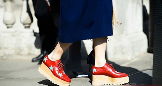 舉個反例,和英國國旗相比,中國國旗配色種類較少、鮮艷奪目且不對稱,將中國國旗融入時尚品之中更考驗設計師的設計水平。設計師更多的是使用五角星元素,而紅色元素并不好嘗試。這種對中國國旗元素的吸收更多的是一種變形,國旗的味道已經減少。下圖是英國品牌Stella McCartney在2014年推出過的借鑒中國國旗元素的厚底鞋單品。