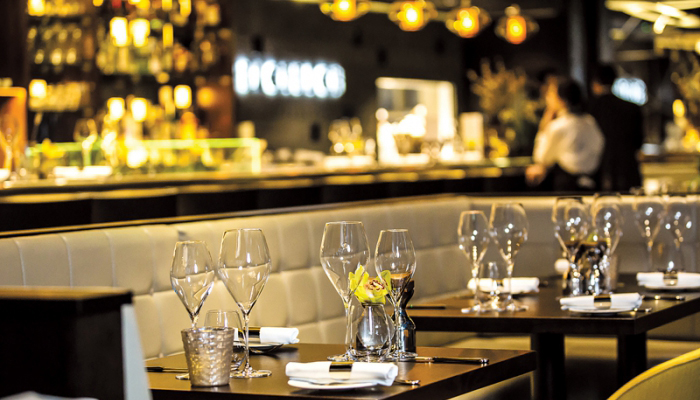 以黑色和褐色為主色彩的室內設計有濃濃的現代 感,金融城的閃爍燈光猖狂地從落地窗闖進室內,讓空間顯得寬廣且亮堂,銀灰色和芥茉黃的沙發點亮了餐廳,打著黃光的吧臺在一系列冷色彩的裝修中帶來了少許 溫暖,黑夜七點,已經坐滿了穿戴正裝的男男女女,倫敦的夜,從這里拉開序幕。