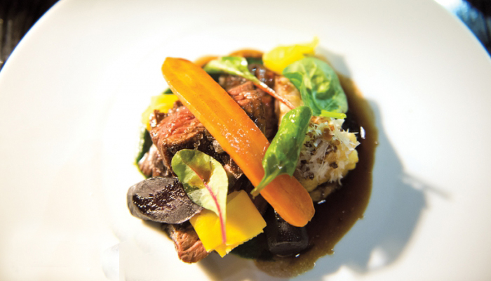 另一道主餐是多佛比目魚(Dover Sole),也稱為鰈魚。魚肉的新鮮說明晰它的新鮮程度,褐蝦散落在一旁提味,微酸的地中海酸豆是刺山柑的花苞(Caper),平衡了海鮮和醬汁的咸味, 還有共同鮮美的海蘆筍,口感分外脆嫩,無愧有“海人參”的美譽。最精華的佐菜是墨魚意大利餃子,外皮軟Q,內餡包有干貝和魚漿餡料,一咬下去就能嘗到濃濃 的檸檬味在嘴里散開,十分令人回味。