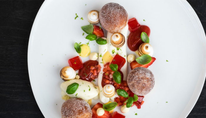 在享受精美的主餐后,甜點帶來了驚喜,阿方索芒果雙皮奶 (Alphonso Mango)是選用被稱為“芒果之王”的阿方索芒果做成的點心,雙皮奶里還看得見香草籽,上層鋪了一層芒果凍,灑上芒果粒、朗姆、椰奶、芝麻和幾片檸檬 葉,最上層加了檸檬汁碎冰,鮮黃色的芒果在碎冰的呼應下閃閃發光,看起來就像一座藝術品,放入嘴里那股酸甜味道久久不散。而溫熱的蘋果黑莓奶酥 (Bramley Apple and Blackberry Crumble)有熬煮過的蘋果泥和香酥的派皮,淋上香草醬一起食用,不會過酸或過甜,而太妃糖冰淇淋也是在苦甜之中獲得完美平衡,冷熱的口感一起在口中 分散,十分令人驚艷。