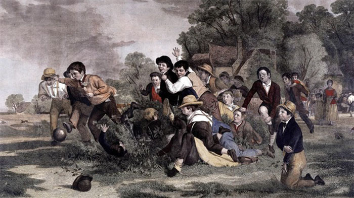 事實上,現代足球的發源地就在英國。追根溯源,足球運動最早出現在羅馬時期,后來傳入高盧地區,由征服者威廉帶到了英國。那時候的足球運動可以用兩個詞來形容——盛大和野蠻,踢足球是一場跨城的全民運動。兩個城鎮,上千人,不顧一切要把球踢到對方的市中心去。球所到之處,無論廣場、農田、商店還是住宅,都逃不過被破壞的命運,造成的效果堪稱狂風過境。但是那時候的英國人對此毫不在乎,只要能把球踢到對方的老窩,受傷流血在所不惜,跟狂熱的恐怖分子一樣。