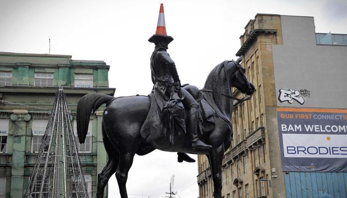 但是為什么小編要說無力吐槽呢?這個事情你聽了之后,你也會無力吐槽的。你就說這樣好端端的一個雕像,這樣霸氣莊嚴的人物,能不能讓人家安靜的在格拉斯哥現代美術館門前做一個“花瓶”呢?格拉斯哥人民的回答是不能!他們偏偏要把英式幽默發揮到能夠彰顯其風采的每一個地方,所以這個雕像從此就有了帽子,一頂并不常規的帽子——交通警示錐。無奈的當局也不知道是哪位富有藝術造詣的市民搗鼓的,所以就只能拆啊,可是拆了又來拆了又來,加上格拉斯哥人民也很喜歡這個不一樣的威靈頓公爵,到后來當局也就“放棄斗爭”了。