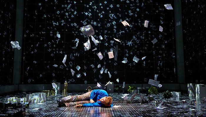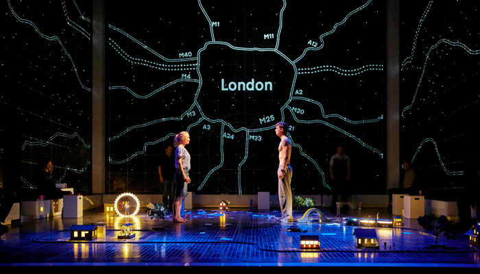 而且它的炫酷一點都不多余,完全是為整個情節而服務。當Christopher幻想成為宇航員時,全息投影技術在舞臺立方體的空間中勾勒了星座的世界、美麗的星云、令人神往的宇宙。而當Chirstopher獨自一人坐火車去倫敦時,各種混雜的播報信息同時響起,舞臺上投射出大量的標志:指示標、廣告、各種商標…