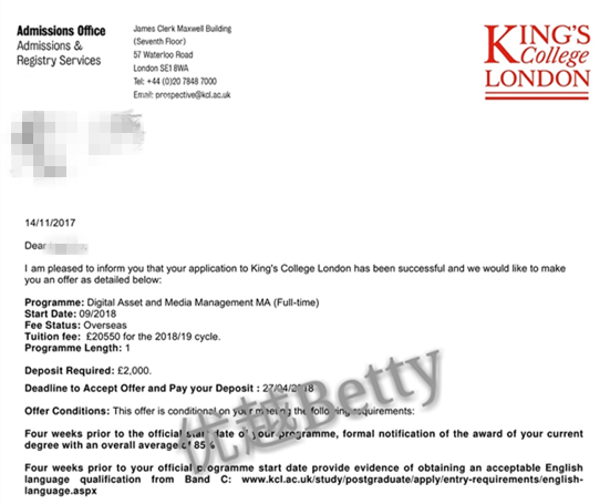 學生背景:D同學,2018年6月本科畢業,申請2018年9月入學的英國研究生,浙江傳媒學院,文化產業管理專業,均分89,無雅思申請,拿到了KCL:Film Studies專業的offer。