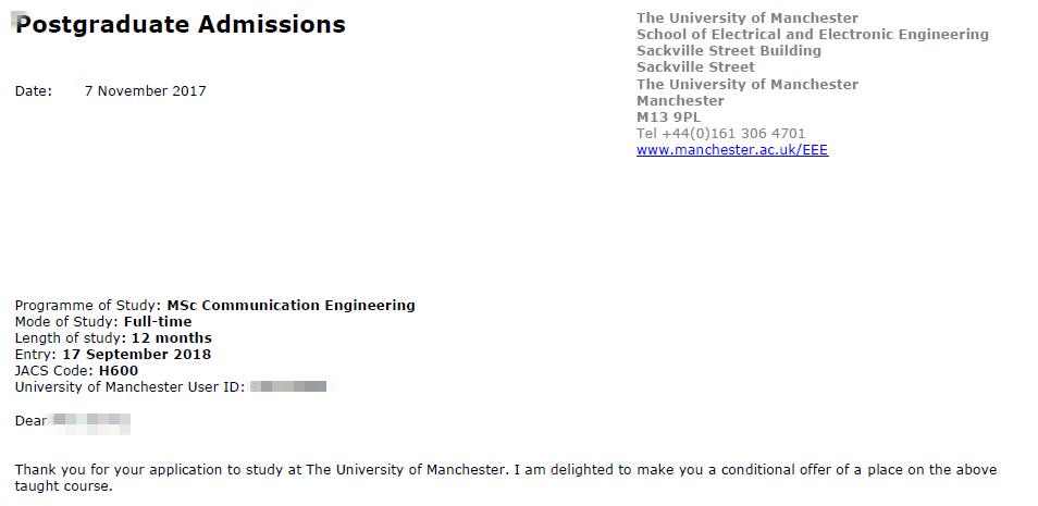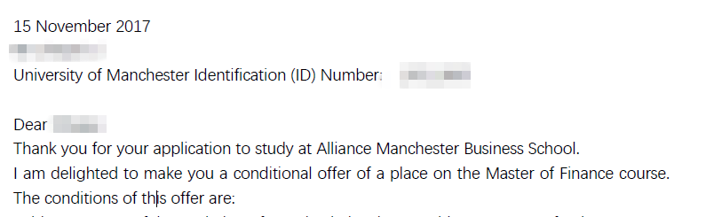 請各位申請者注意, 曼大商學院的MSc Accounting and Finance專業如果拿到Offer,Offer Condition 可能除了對Degree總分有65%的要求之外,會要求大四的單科成績達到65% 以上。