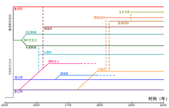 宗教改革之后興起的新教的教派主要是三個:路德宗(Letherans)、加爾文宗(Calvinists)以及圣公會(Anglicans)。