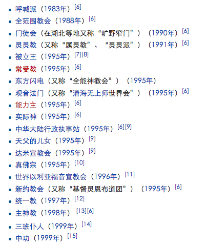 由于新教大大小小的教派繁多,因此里面不免魚龍混雜。很多教義扭曲的邪教也混跡在其中,譬如去年國內招遠慘案中的全能神教也是自稱是信奉新教教義的基督教。微博賬號央視評論員曾經發過一個帖子教育大家怎么樣辨別邪教。主要是以下這幾條:“邪教具有強烈的排他性,始終宣傳自己是最偉大的;邪教具有強烈的強迫性,通過洗腦和自我標榜來確立自己的正確性;邪教具有通過壓迫別人來獲得利益的特性;邪教內部通過裙帶和其他手段來構筑內部關系網,以保證其利益;邪教往往嘴上說的很好,實際上做著最齷齪的事情”。在2005年中國公安部發布的《中華人民共和國公安部關于認定和取締邪教組織若干問題的通知》中認定和明確了14中邪教組織。下圖是國內這14個邪教組織的名單(來源:維基百科):