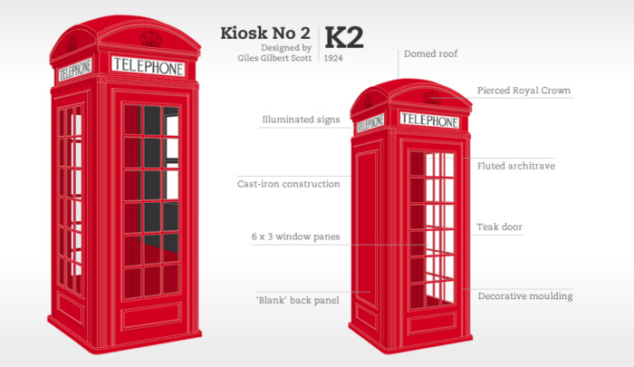 第一代的電話亭是由郵政總署(The General Post Office) 在1920 年主持設計的,名字為Kiosk No.1,簡稱K1。不過K1沒能一帆風順,包括市政聯席執委會、皇家建筑師學會、城市規劃學會、 皇家藝術學會在內的許多機構都表示對K1的不滿,要求重新設計,所以很快,郵政總署把設計服務外包出去,通過邀請的方式,找了三位著名建筑師來設計各自的方案,期望從中挑選出最令人滿意的作品。