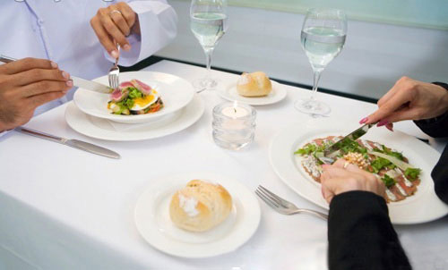 如果用歐式的刀叉用法,在整個就餐過程中都可以不用放下刀叉,不管是咀嚼食物或是與他人交談。但切記不要手拿刀叉空中揮舞,要做手勢,就將刀叉放下。不要一只手拿刀或叉,而另一只手拿餐巾擦嘴,也不要一只手拿酒杯,另一只手拿叉取菜。
