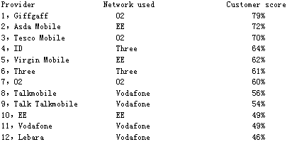 根據上述排名,盡管在線供應商Giffgaff沒有自己的商店和呼叫中心,但該家通訊服務連續第二年排名榜首。緊隨其后的是Asda公司的移動服務,客戶評分高達72%。